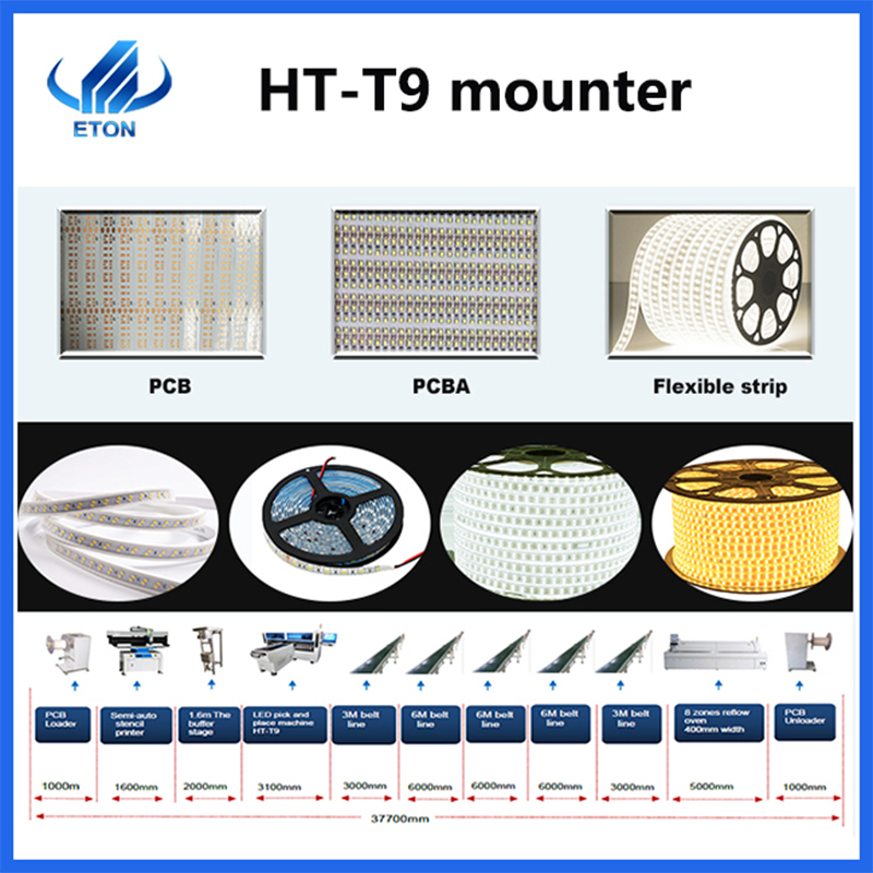 High speed mounter HT-T9 for flexible strip, can produce 4 types materials at the same time with high capacity, available for 5M,50M, or any length of flexible strip and roll to roll