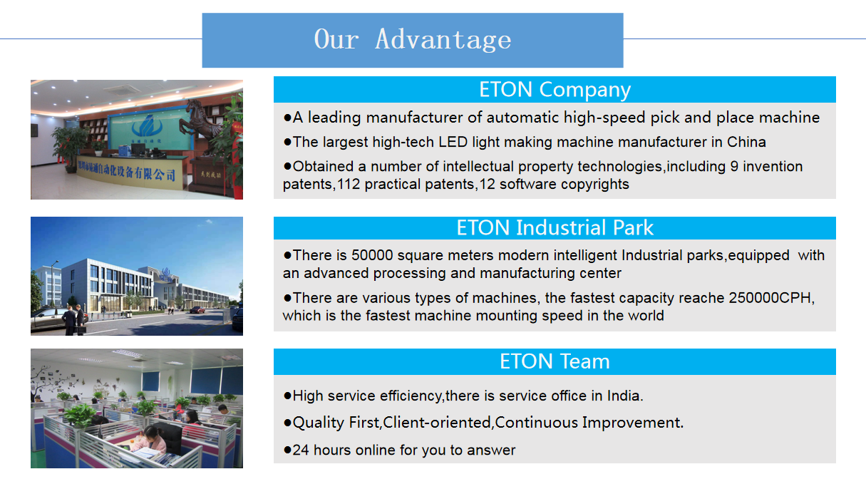1, 50000 square meters industrial park ensure the brand effect and present company strength. 2, Own manufacturing center, equipped with an advanced processing and manufacturing center, strict quality control, and standardize production, streamline production processes make our machines has high quality standard and strong supply capacity. 3, Advanced in technology and innovation. Has 9 invention patents, 12 software copyrights and 112 practical patents. 4, The biggest manufacturer for LED SMT machines in China, which has occurred 85% market in China and has exported our machines to India, Vietnam, Korea, Japan, Turkey, Tunisia, Egypt etc more than 20 countries.