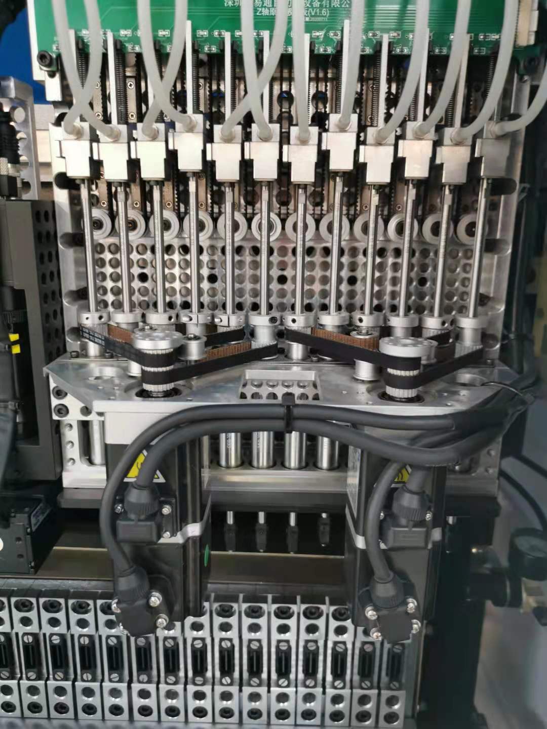 10 PCS nozzles can group picking and separately placing,seprately picking and separately placing,Because each head is controlled by an independent motor.The mounting head can high speed and accurate mounting lens, LED chip, capacitors, resistors, shaped components.