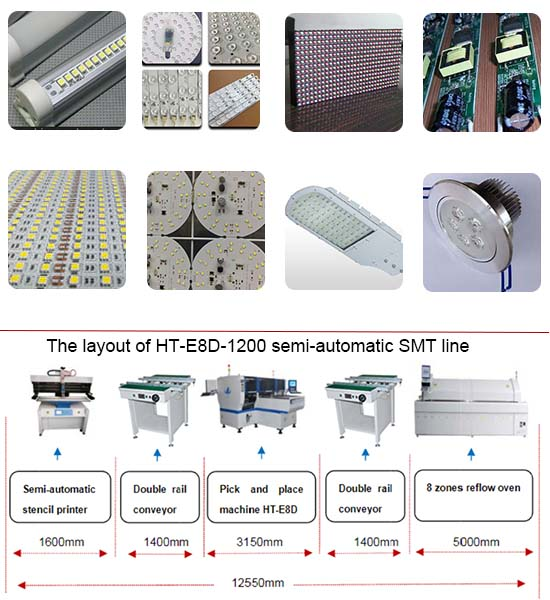 1.HT-E8D-1200:Double-module magnetic motor multifunctional pick and place machine.24 heads, optimum mounting speed reached 90000 CPH.The actual production capacity should be determined according to the mounted products and the actual production situation