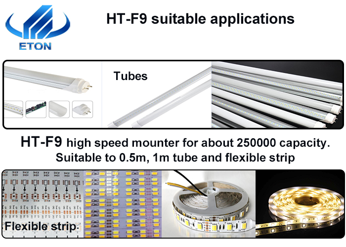 HT-F9 apply to the 0.6m, 0.9m, 1.2m rigid PCB and 0.5m, 1m LED flexible strip, producing with 4 types materials at the same time with high capacity, available for board with any proportion of LED chip and resistor.