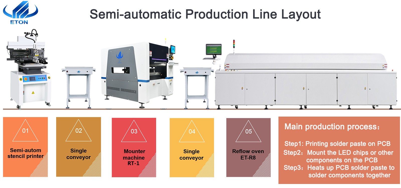 Solder paste printing machine,conveyor, Pick and Place machine, reflow oven.