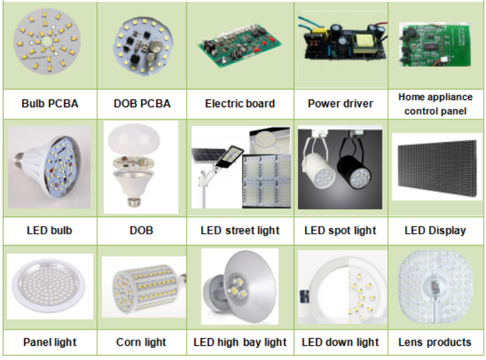 For HE-E8D, it not only can mount DOB bulb, also can mount led tube, down light, spot light, street light, flood light, table light, panel light, ceiling light, led flexible strip, LED display screen, electric board, power driver lens, and so on