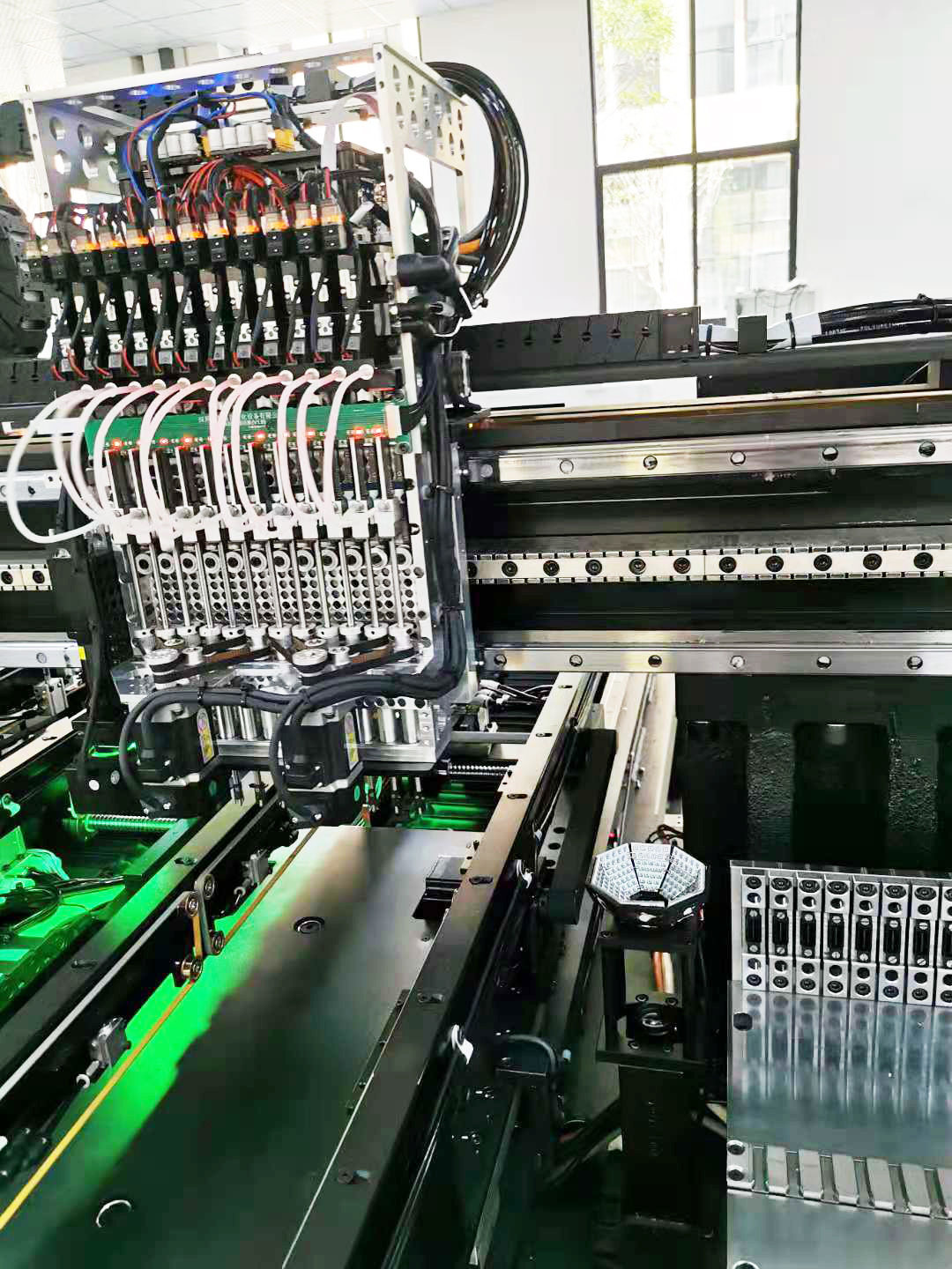 HT-E8D has 24 heads and 48 feeders station with double mounting heads,one mounting head has 12 heads, each head is controlled independently by one servo motor